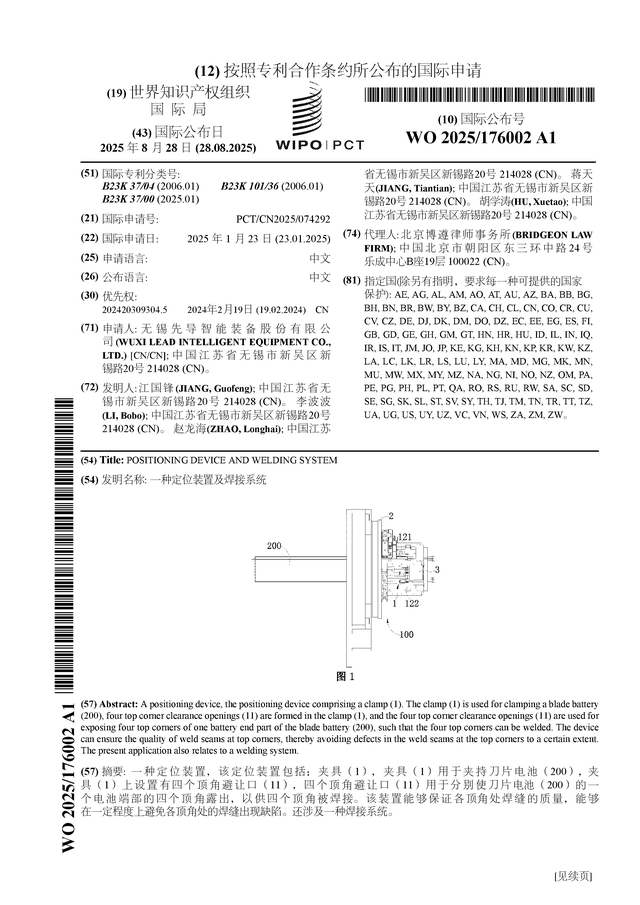 证券之星消息,根据企查查数据显示先导智能(300450)公布了一项国际专利申请,专利名为“一种定位装置及焊接系统”,专利申请号为PCT/CN2025/074292,国际公布日为2025年8月28日。